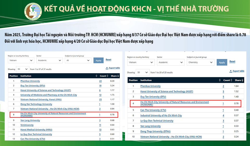 Trường Đại học Tài nguyên và Môi trường TP. HCM luôn xác định nghiên cứu khoa học và chuyển giao công nghệ là một trong những nhiệm vụ trọng tâm, góp phần nâng cao chất lượng đào tạo và phục vụ cộng đồng. Giai đoạn 2016 - 2025, các hoạt động nghiên cứu khoa học của Nhà Ttrường được triển khai theo định hướng liên ngành, gắn với thực tiễn và nhu cầu phát triển bền vững.