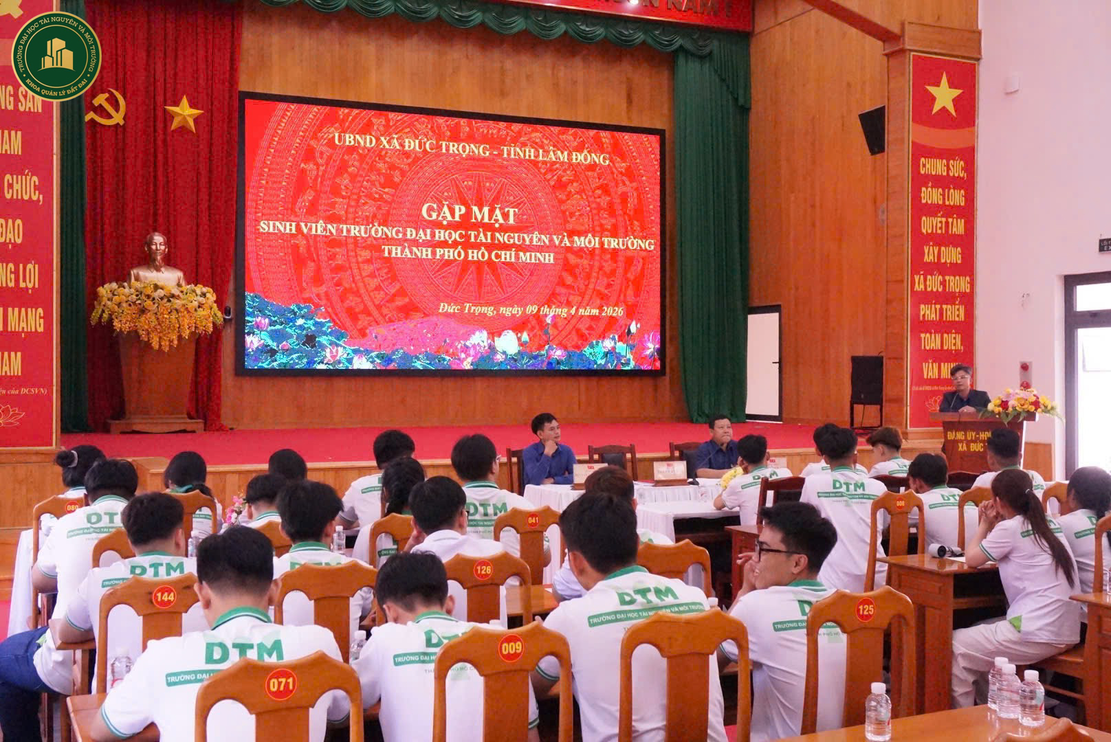 Tiếp nối chương trình, đoàn đã đến tham quan và tìm hiểu thực tế tại Ủy ban nhân dân xã Đức Trọng. Những chia sẻ của Phó Chủ tịch xã Trần Văn Hải về tình hình phát triển kinh tế – xã hội, cũng như công tác quản lý đất đai trong bối cảnh mới đã mang lại cho sinh viên cái nhìn chân thực về vai trò của ngành trong khu vực công. Không chỉ nghe, sinh viên còn trực tiếp tìm hiểu hoạt động của các bộ phận chuyên môn như địa chính – xây dựng, tư pháp – hộ tịch, văn phòng – thống kê. Qua đó, quy trình quản lý, vận hành bộ máy hành chính được tái hiện rõ ràng, giúp sinh viên hình dung cụ thể hơn về vị trí việc làm trong tương lai.