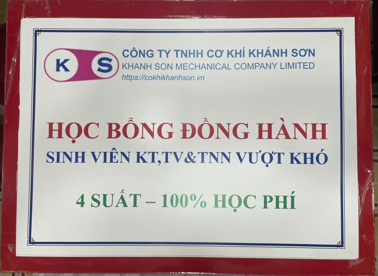 - ♦ 04 suất học bổng toàn phần (100% học phí) từ Công ty TNHH Cơ khí Khánh Sơn dành cho sinh viên có hoàn cảnh khó khăn.
