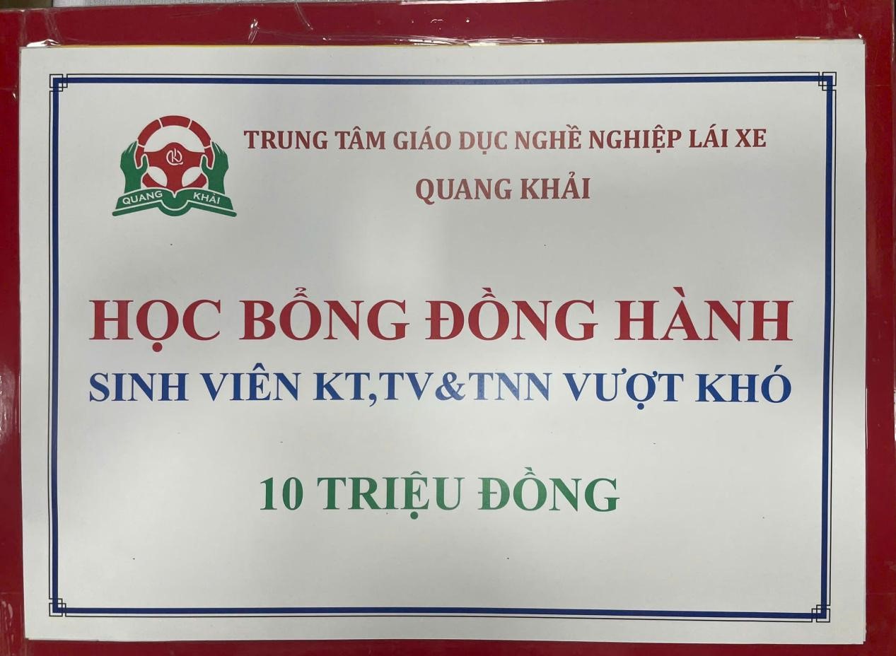 - ♦ 10 triệu đồng học bổng từ Trung tâm Giáo dục nghề nghiệp lái xe Quang Khải để hỗ trợ sinh viên vượt khó.