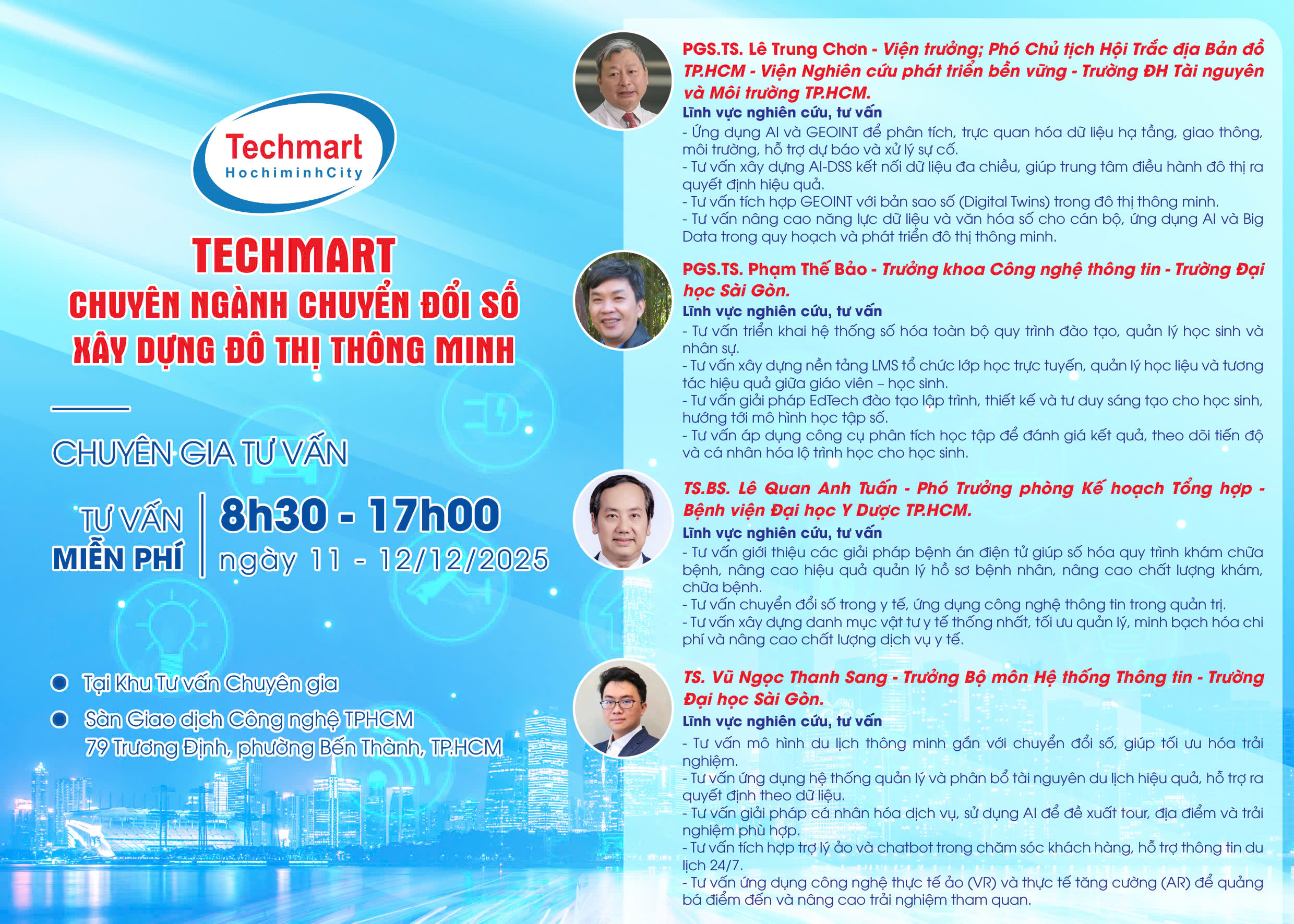 Trong khuôn khổ chuỗi hoạt động của sự kiện “Chợ công nghệ và thiết bị (Techmart) chuyên ngành Chuyển đổi số xây dựng đô thị thông minh năm 2025”, diễn ra trong hai ngày 11–12/12/2025 tại Sàn Giao dịch Công nghệ (79 Trương Định, phường Bến Thành, TP.HCM) và trên nền tảng trực tuyến techmart.techport.vn, khu tư vấn chuyên gia tiếp tục thu hút sự quan tâm của nhiều đơn vị. Thay vì chỉ tìm hiểu công nghệ mới, phần lớn các tổ chức, doanh nghiệp tìm đến khu tư vấn với mong muốn được trao đổi, phân tích và định hướng cách tiếp cận chuyển đổi số phù hợp với năng lực và nhu cầu triển khai thực tế.