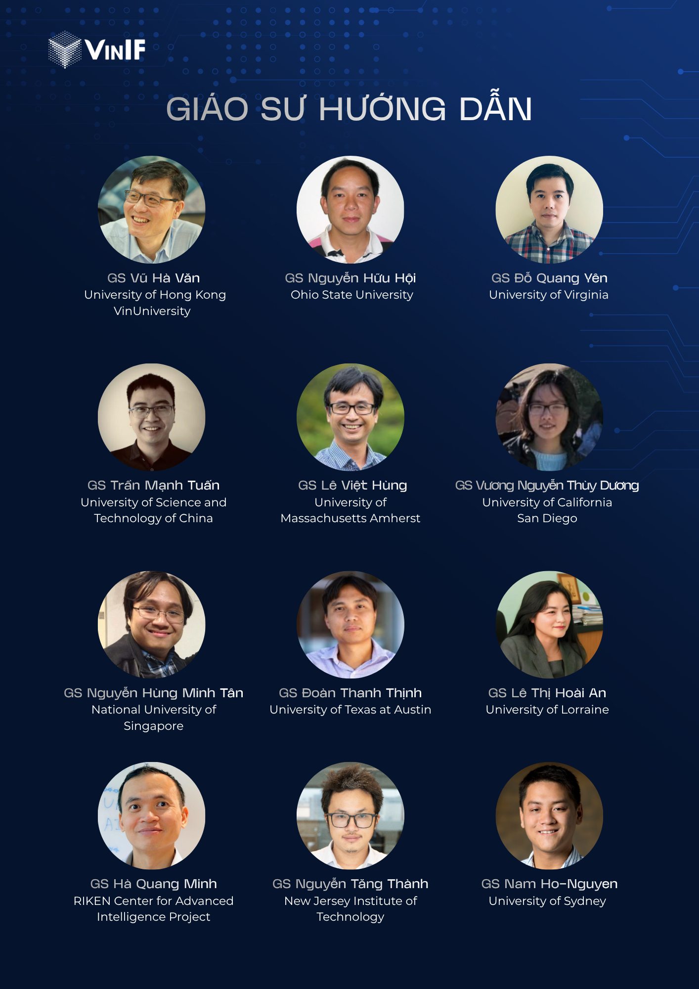 + Giáo sư, chuyên gia hướng dẫn: GS. Vũ Hà Văn (Hongkong University/VinUniversity); GS. Nguyễn Hữu Hội (Ohio State University); GS. Trần Mạnh Tuấn (University of Science and Technology of China); GS. Nguyễn Hùng Minh Tân (National University of Singapore); GS. Lê Việt Hùng (University of Massachusetts Amherst); GS. Đỗ Quang Yên (University of Virginia); GS. Vương Nguyễn Thùy Dương (University of California San Diego); GS. Đoàn Thanh Thịnh (University of Texas at Austin); GS. Lê Thị Hoài An (University of Lorraine); GS. Hà Quang Minh (RIKEN Center for Advanced Intelligence Project); GS. Nguyễn Tăng Thành (New Jersey Institute of Technology); GS. Nam Ho-Nguyen (University of Sydney).