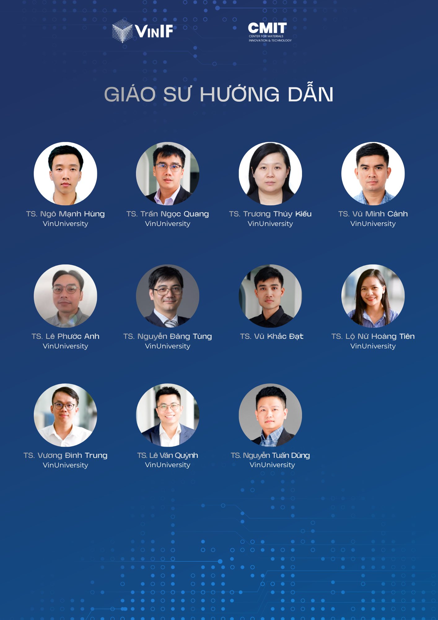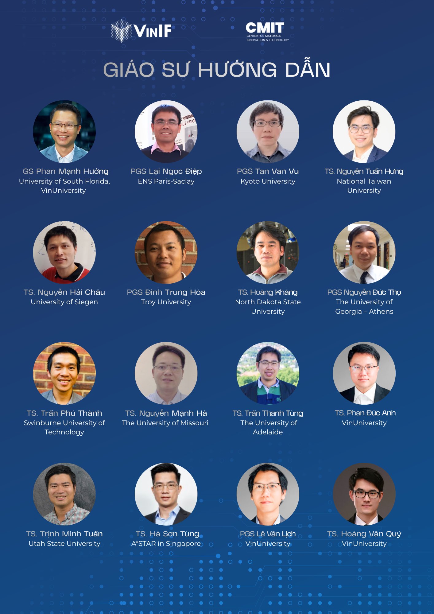 + Giáo sư, chuyên gia hướng dẫn: GS. Phan Mạnh Hưởng (University of South Florida/VinUniversity); PGS Lại Ngọc Điệp (ENS Paris-Saclay); PGS Tan Van Vu (Kyoto University); TS. Hoàng Kháng (North Dakota State University); TS. Nguyễn Tuấn Hưng (National Taiwan University); TS. Trần Phú Thành (Swinburne University of Technology); TS. Nguyễn Mạnh Hà (The University of Missouri); TS. Trần Thanh Tùng (The University of Adelaide); PGS. Nguyễn Đức Thọ (The University of Georgia - Athens); TS. Nguyễn Hải Châu (University of Siegen); TS. Trịnh Minh Tuấn (Utah State University); TS. Hà Sơn Tùng (A*STAR in Singapore); cùng các giáo sư, chuyên gia tại VinUniversity.
