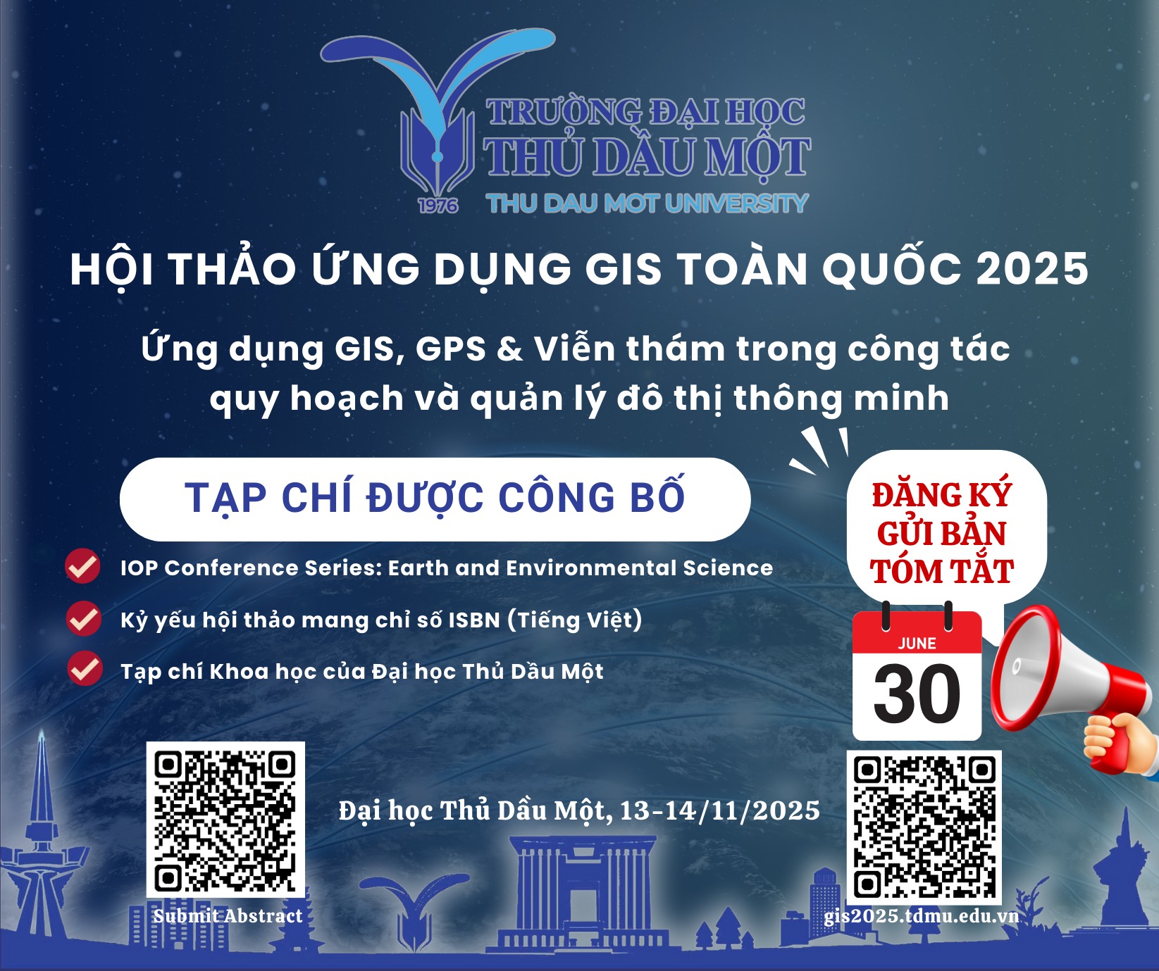 - Ban Tổ chức Hội thảo GIS 2025 trân trọng kính mời quý vị nhà khoa học, nhà nghiên cứu, giảng viên, học viên và sinh viên trên cả nước và quốc tế tham gia gửi bài tóm tắt (abstract) Hội thảo Khoa học GIS toàn quốc 2025, được tổ chức bởi Trường Đại học Thủ Dầu Một.