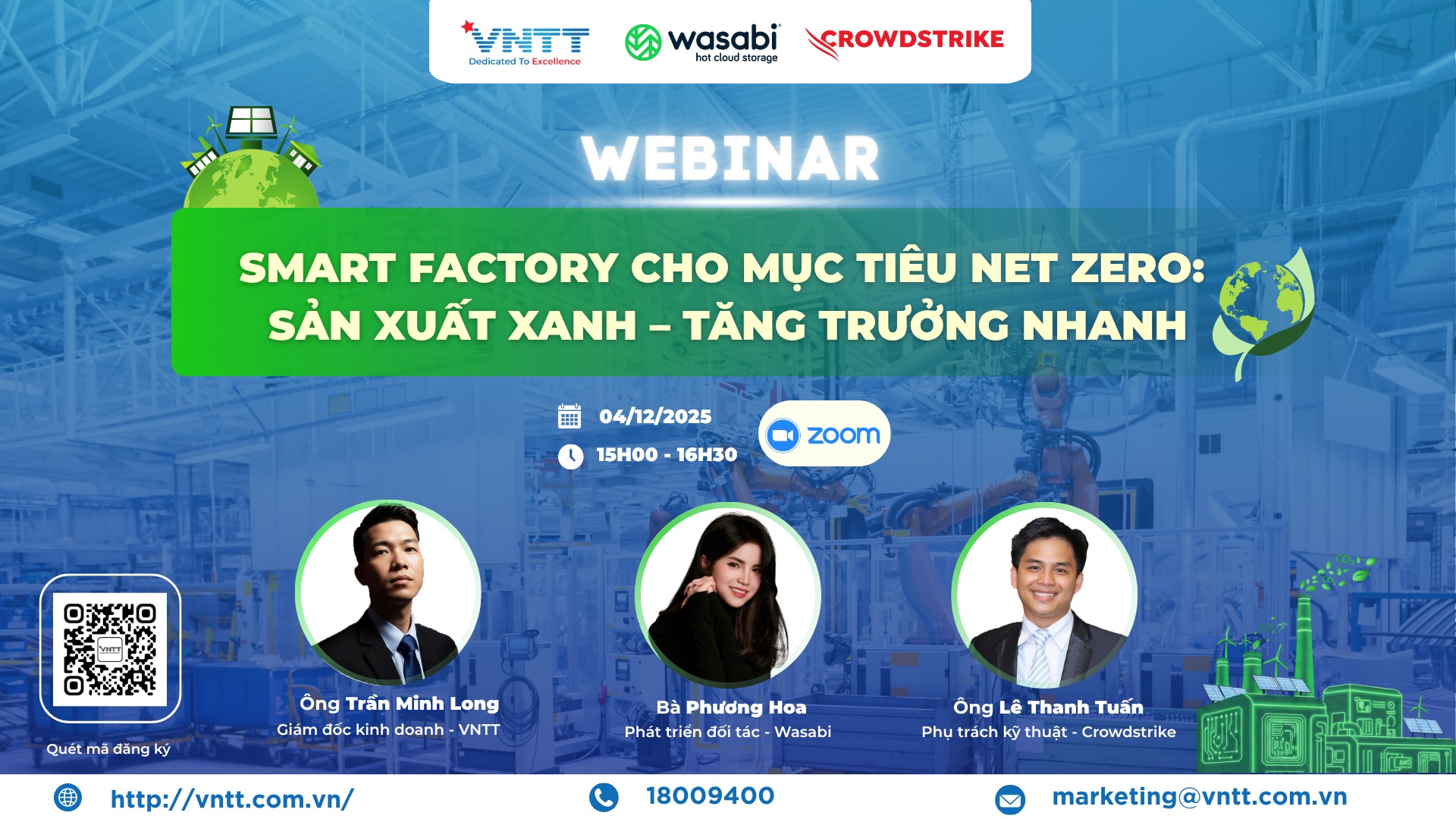 - VNTT phối hợp cùng CrowdStrike và Wasabi tổ chức webinar "Smart Factory cho mục tiêu Net Zero: Sản xuất xanh - Tăng trưởng nhanh".