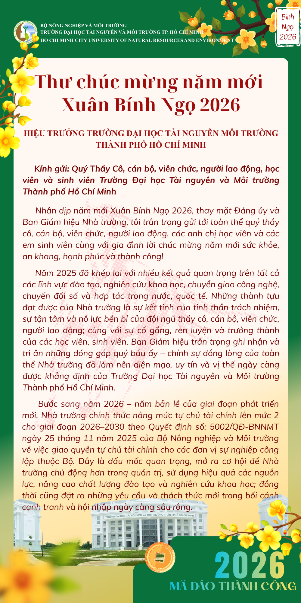 Là trường đại học công lập duy nhất phía Nam trực thuộc Bộ Nông nghiệp và Môi trường, trải qua 50 năm xây dựng và phát triển, Trường Đại học Tài nguyên và Môi trường TP. Hồ Chí Minh đã khẳng định được vị thế trong hệ thống giáo dục đại học đào tạo nguồn nhân lực có trình độ trong lĩnh vực công nghệ, quản lý tài nguyên, đảm bảo môi trường sạch cho phát triển bền vững và cùng thế giới ứng phó với các vấn đề biển đổi khí hậu trên toàn cầu.